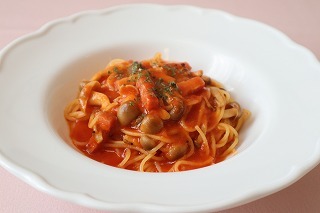香ばしいベーコンときのこがたっぷりのトマトソースは